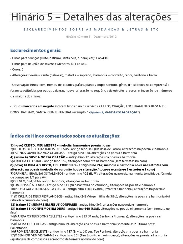 Ver las letras de hinário 5 ccb y escuchar o meu socorro vem do senhor, maravilhosa graça, conserva a paz, galardão nos espera y más canciones! Uma pena pois tinha um trabalho de estudo muito bom a. Listas de hinos por categoria hinário 5 (480 hinos cantados): 1.3k views · july 26. Violino, viola, violoncelo, acordeon, clarinete, flauta, gaita.